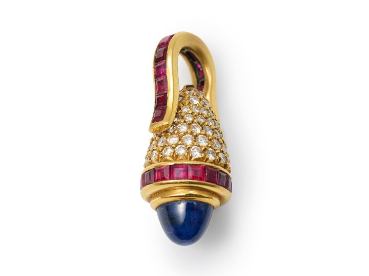 - Ruby, sapphire & diamond enhancer pendant, cone-shaped elegance, estimate R25 000 – R30 000