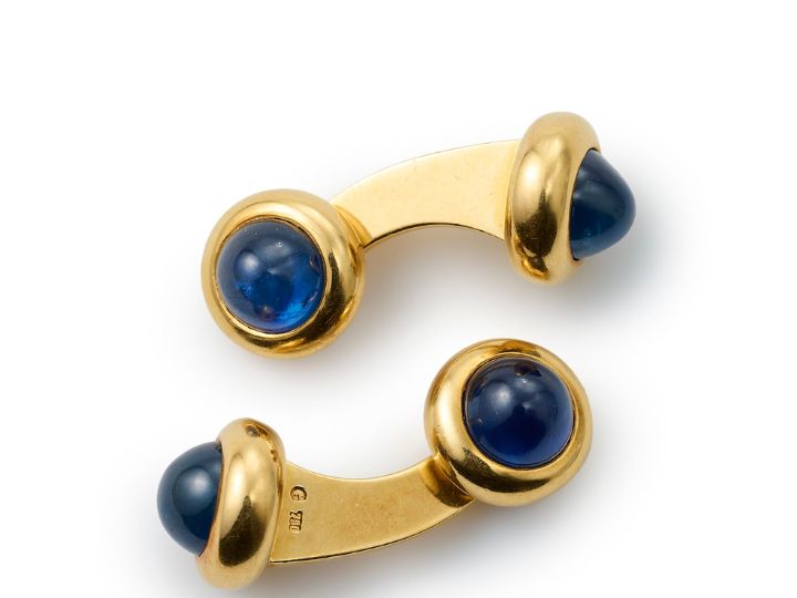 - Gold & sapphire cufflinks set with cabochon sapphires, sleek twisted bar design, total weight 14.80g – a nod to refined city glamour