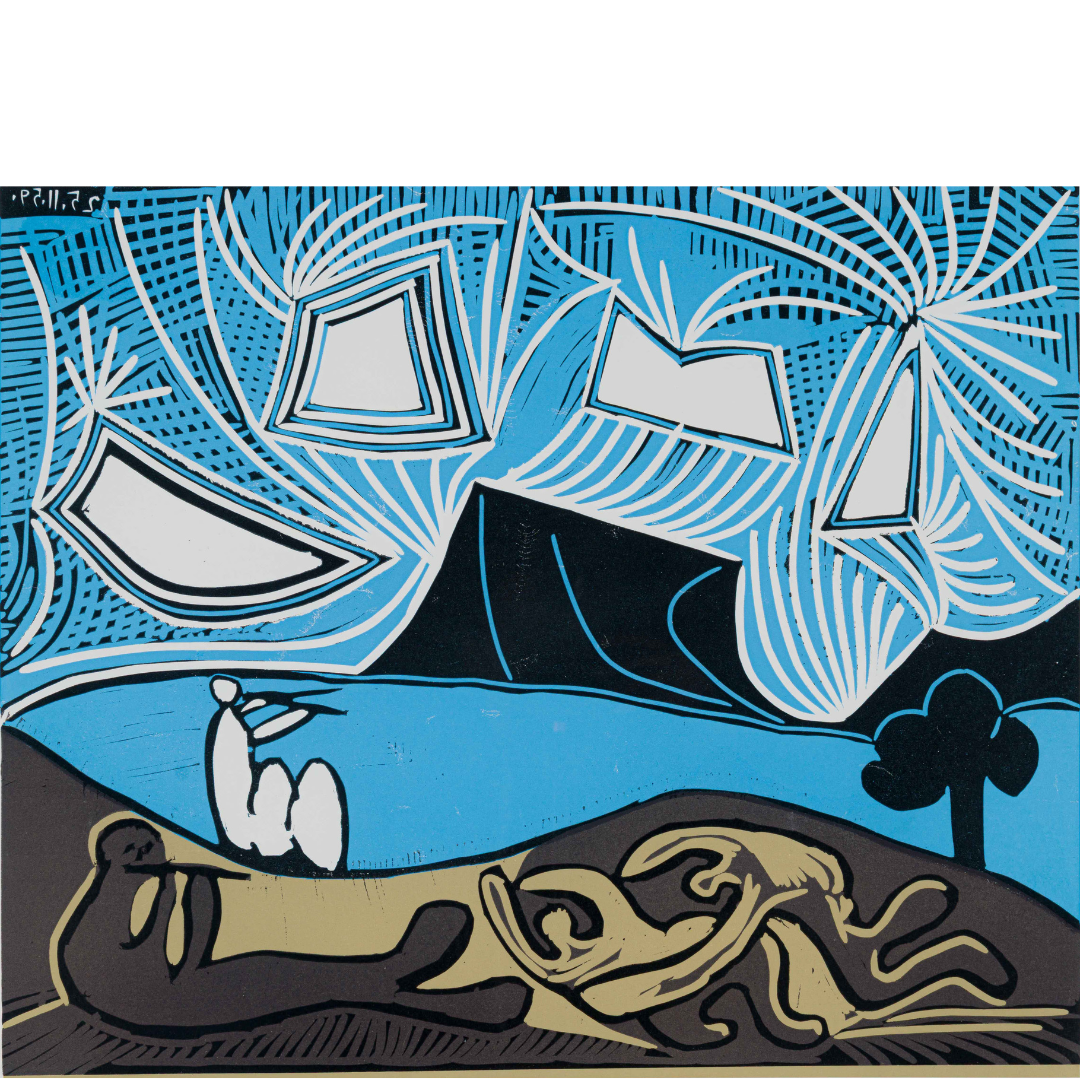 Marine scenes dominate across both sessions. Important works in this popular genre include Edwardian painter Montague Dawson’s A Clipper under Full Sail (estimate R500 000 – 700 000 / $29 075 – 40 705) and Pablo Picasso’s 1959 linocut Bacchanale Avec Chevreau Et Spectateur (Couple and Flutist at the Edge of a Lake) (estimate R800 000 – 1 200 000 / $46 532 – 69 795), printed with master printmaker Hidalgo Arnéra. Reflecting the broad tastes and pathways of South African collectors, the catalogue also includes four watercolours by Indian artist Pralhad Anant Dhond, two works capturing the moods of Indian poet and political artist Chittaprosad Bhattacharya, a vibrant 1992 oil by Brazilian painter Juarez Machado, and three of American contemporary artist James Austin Murray’s signature black oil paintings, prized for their textured surfaces and depth.