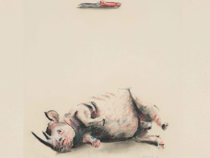 the striking image of an overturned rhinoceros, a motif echoed decades later in Kentridge’s acclaimed public sculpture Over My Dead Body.