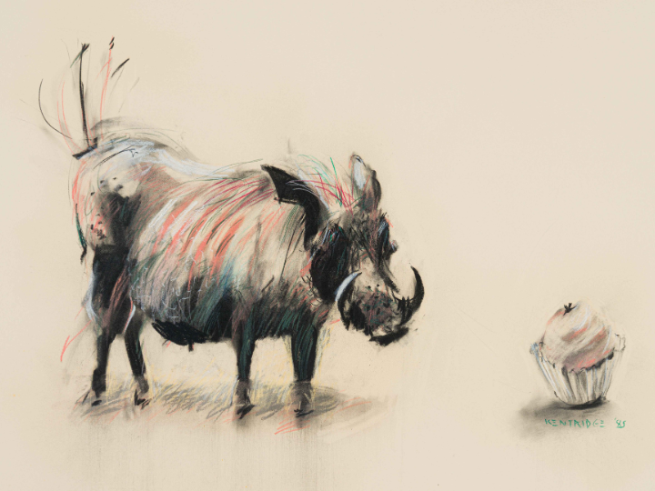 While human behaviour has long been a central concern in Kentridge’s oeuvre, animals – real, symbolic and allegorical – recur throughout his early works. In the mid-1980s alone, they appeared in major pieces such as The Conservationists’ Ball (1985) and the Renoir-inspired The Boating Party (1985), as well as in political cartoons he briefly produced for The Weekly Mail, signed under the playful pseudonym “PH Chere”, a nod to the French term for warthog: phacochère.