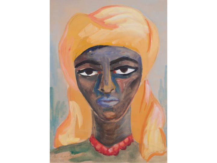 The genres of these two lots, one a portrait and the other a landscape study, broadly reflect the collecting interests represented in the Boiskin Art Collection. The collection includes superb landscape studies by Walter Battiss, Maggie Laubser, George Pemba, J. H. Pierneef, Durant Sihlali and Maud Sumner. Pierneef’s Mountain Landscape with a Tree in the Foreground (estimate R300 000 – 500 000 / $17 793 – 29 656) dates from 1923, a period of growing national acclaim. Laubser’s magical Landscape with Houses and a Figure (estimate R350 000 – 450 000 / $20 759 – 26 690) was previously owned by Lithuanian-born sculptor Solly Disner.