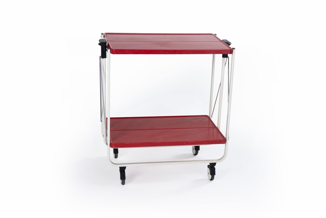 This rare two-tier trolley provides space for drinks & display. The folding trolley locks when in the open position.