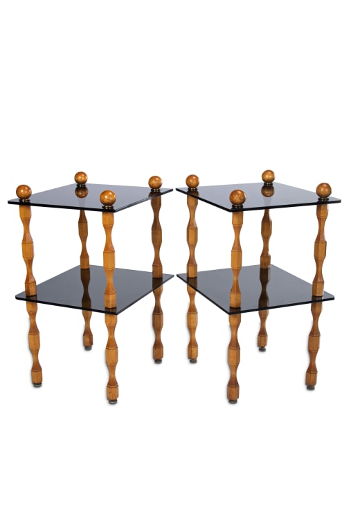 each with rectangular smokey glass top and conforming shelf below, raised on undulating spindle legs terminating in bulbous finials
