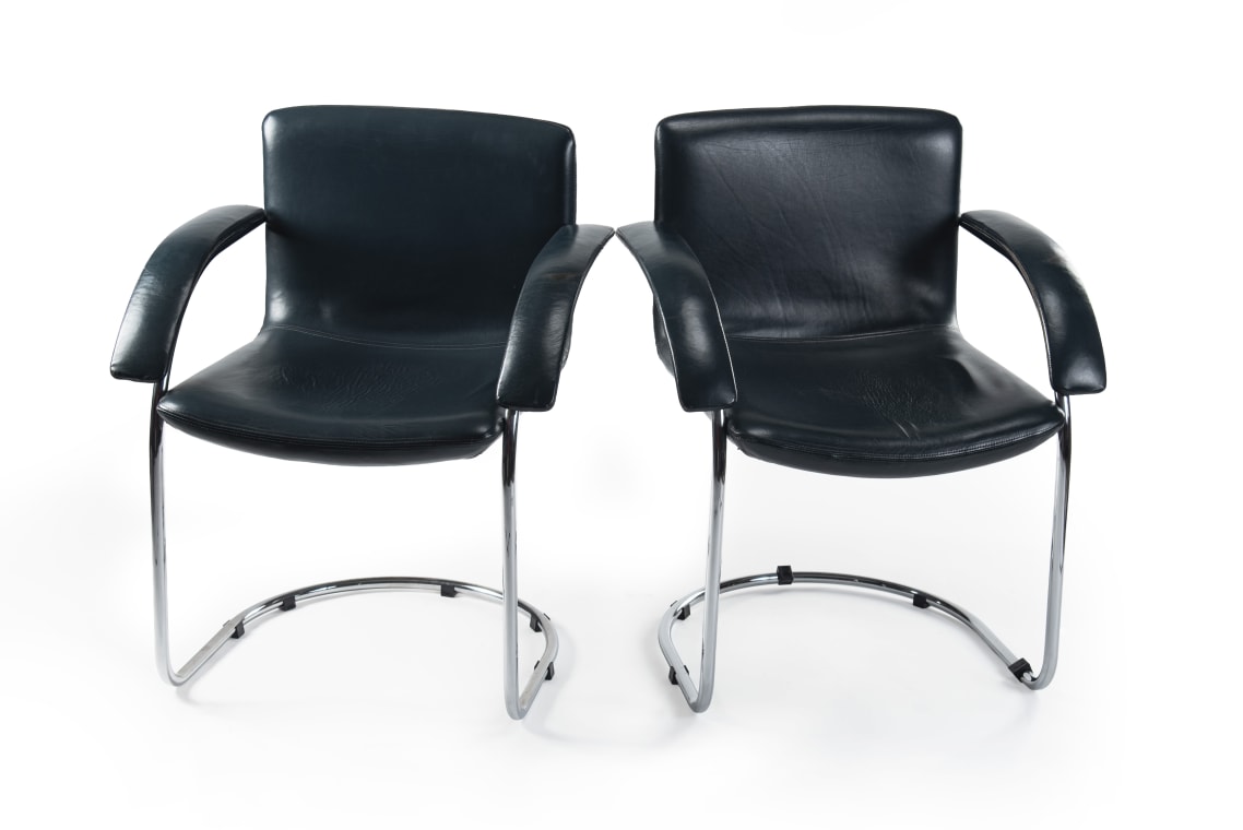 each with cantilevered steel frame, leather upholstered back, seat and armrest
