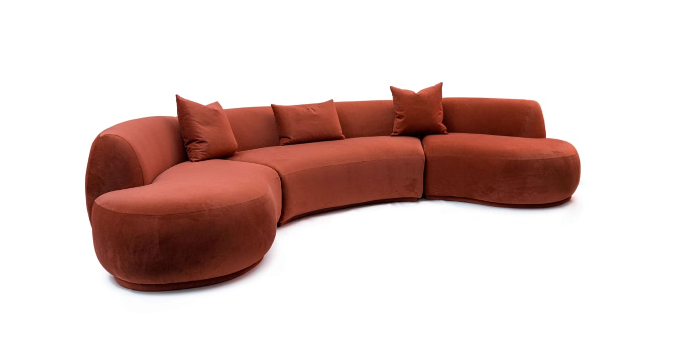 the curved back and seat comprising three sections, upholstered in rust-coloured velvet fabric