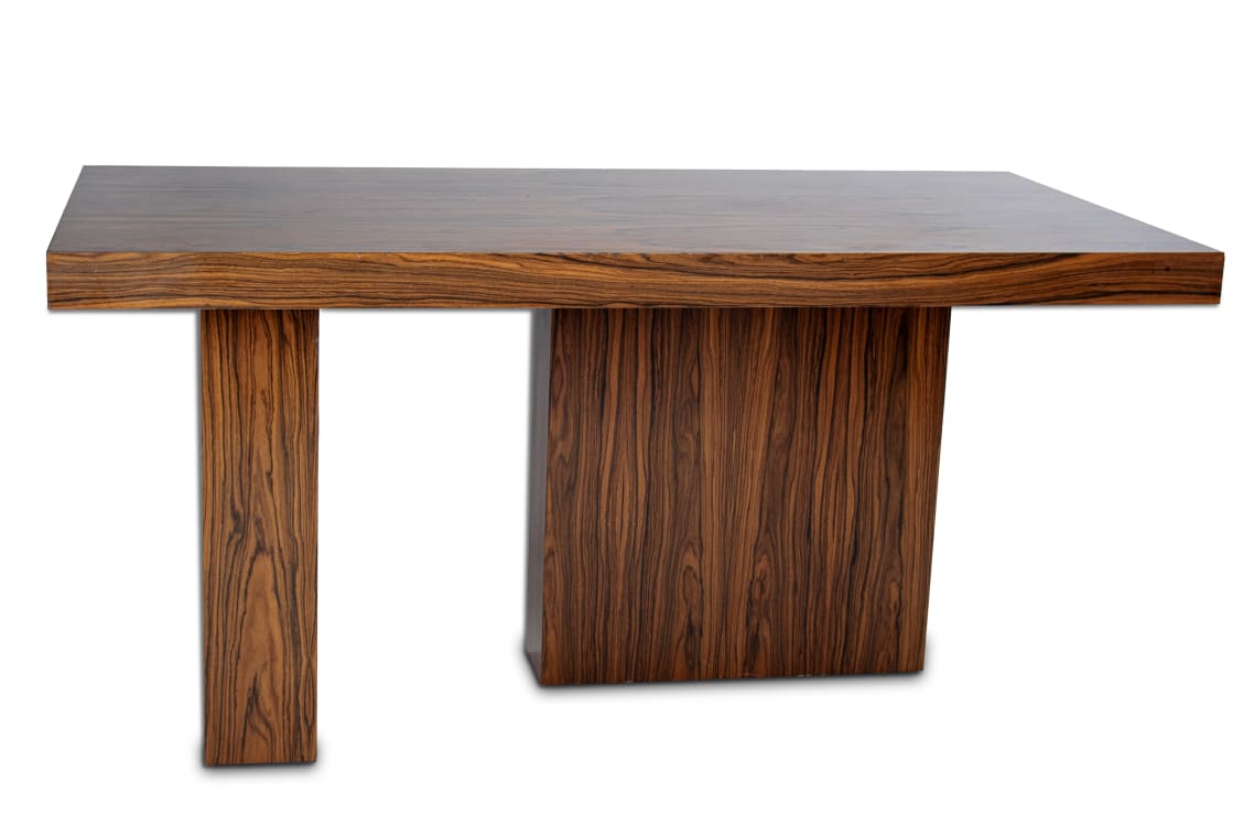 The bold and minimal design of this table is typical of the1970s modernist luxury office furniture. The zebrano-effect veneer is also consistent with furniture of this period.