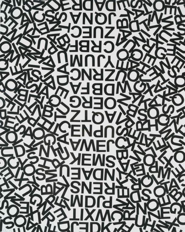In “Lost track I and II” one sees the negative spaces and not the letters for what they are. The letters build up a texture, much like grains of sand that are then flattened and become “ordered” once a vehicle has moved over them. The prints read as a single track or foot path when viewed on their own. When viewed together they become a road. The letters were placed deliberately not to make up any words.