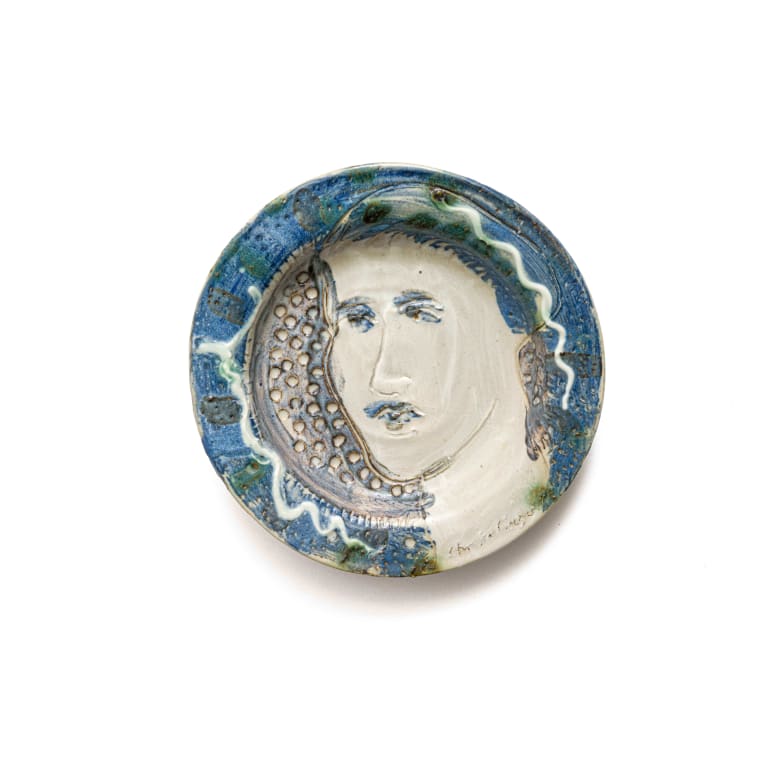Bowl with Zulu warrior motif; Double-handeled dish decorated with chameleons; Lidded vessel with floral motif, three