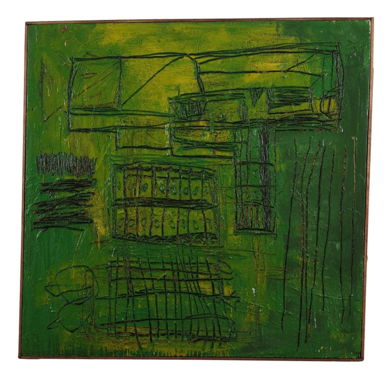 oil, enamel, and bitumen on canvas, in the artist's handmade frame