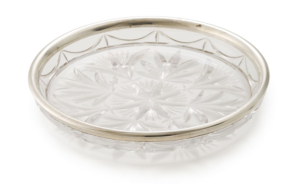 circular, with star cut base, mounted by a silver border