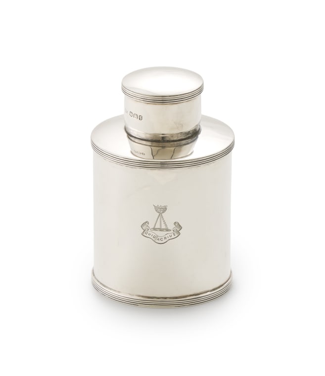 cylindrical, the center engraved with a crest, with reeded borders and detachable cover, 130g