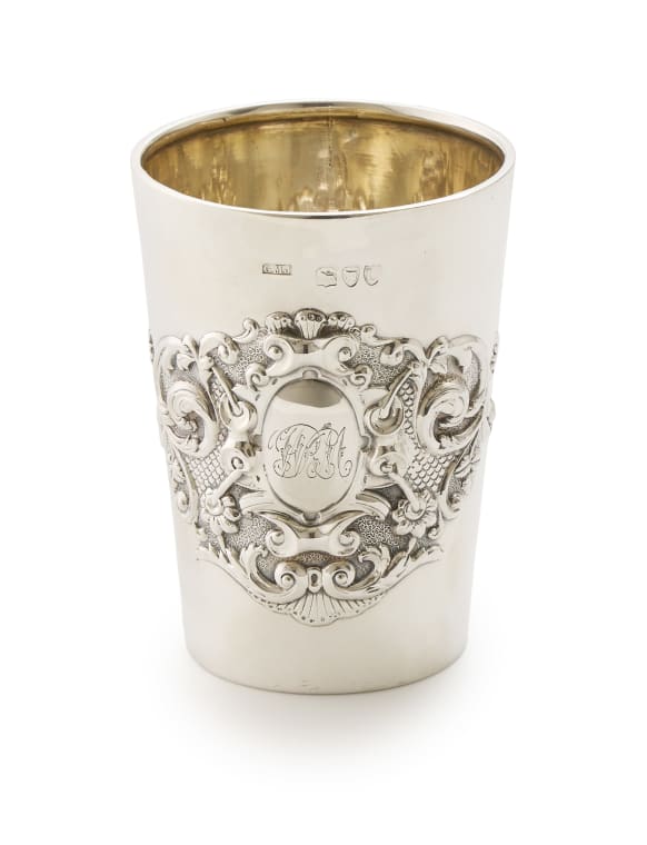 tapering, the front moulded and chased with scrolling foliage and flowers, cartouche engraved with initials, gilt interior, 125g