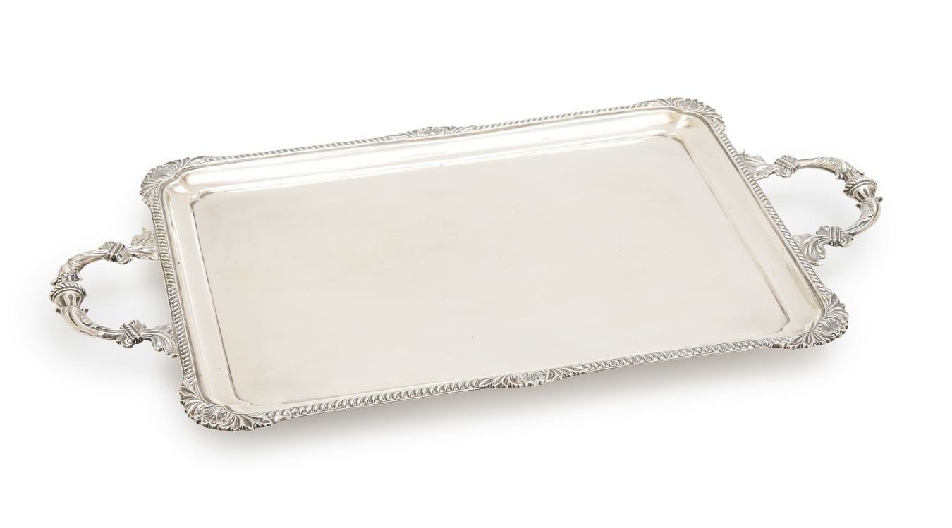 rectangular, with gadrooned shell-and acanthus-leaf border, the sides applied with rope-twist and acanthus-leaf handles, raised on four ball feet, 2765g