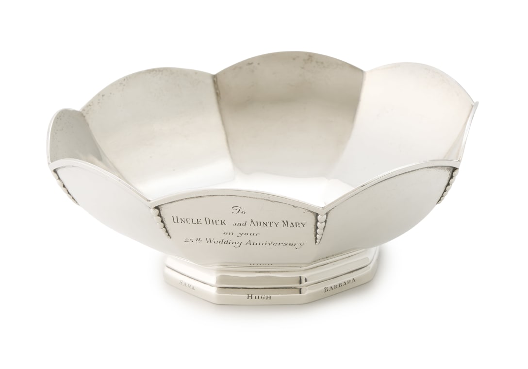 octagonal, the side engraved 'TOUNCLE DICK AND AUNTY MARY on your 25th Wedding Anniversary', raised on a conforming foot engraved with the names; 'BARBARA, DEREK, MARY, PETER, ANN, ELSPETH, SARA and HUGH', 505g