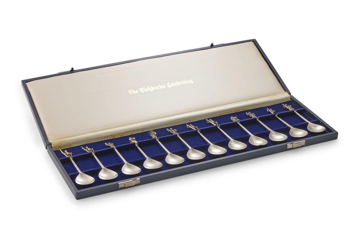 The set comes in the original box, accompanied by a signed certificate; The Tichborne Celebrities, The original set of twelve spoons designed in 1592 by Christopher Wace was presented to Sir Robert Tichborne in 1656 and destined to carry his family name.
