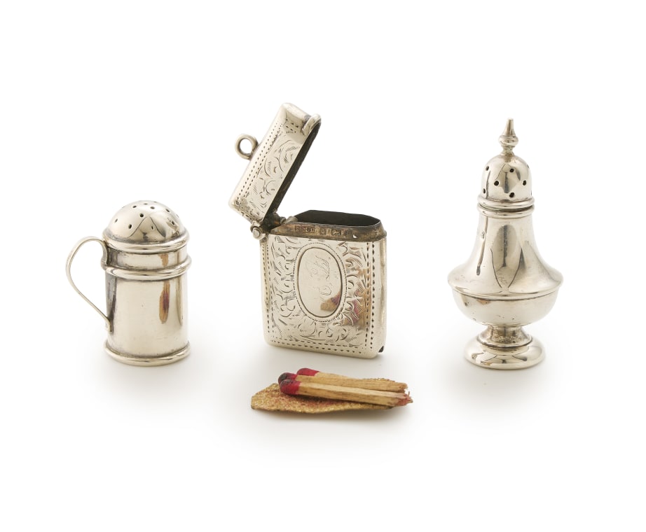 cylindrical, with girdle, the side applied with c-scroll handle; another, bulbous body with urn-shaped finial on a stepped circular footrim; and a vesta case, unmarked, the center engraved with initials, enclosed by foliate borders, with ring attachment, 35g all in