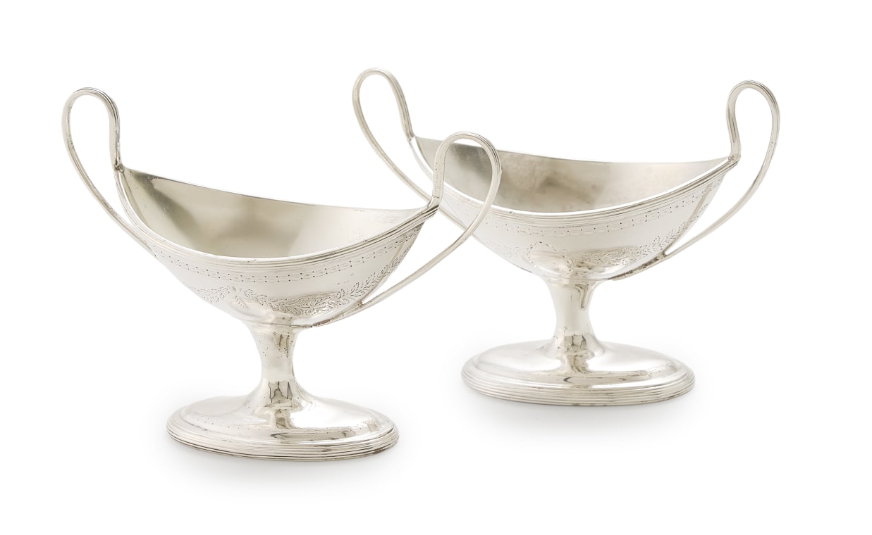 each oval form with reeded borders, the body engraved with floral swags, the sides applied with with c-scroll handles, raised on a tapering oval footrim, 217g all in