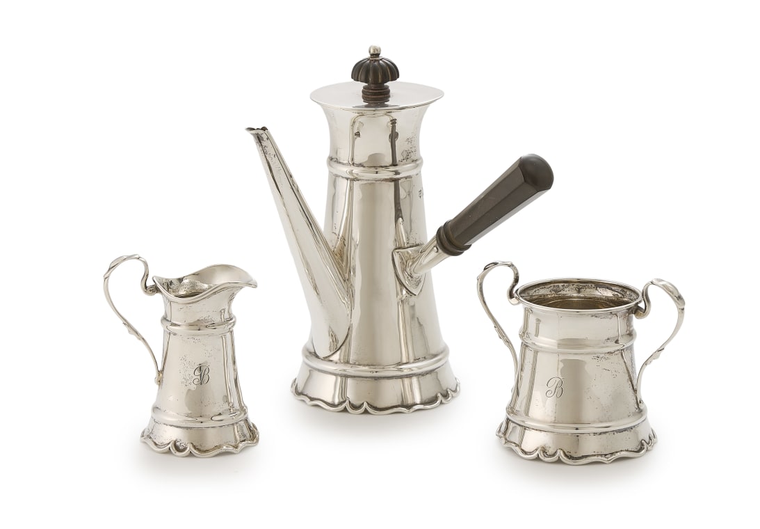 comprising: hot chocolate pot, two-handled sugar basin and milk jug, tapering body, the center engraved with initial 'B' with borders, the hinged cover surmounted by a finial, the side applied with an ebony handle on a wavy footrim border, 410g all in