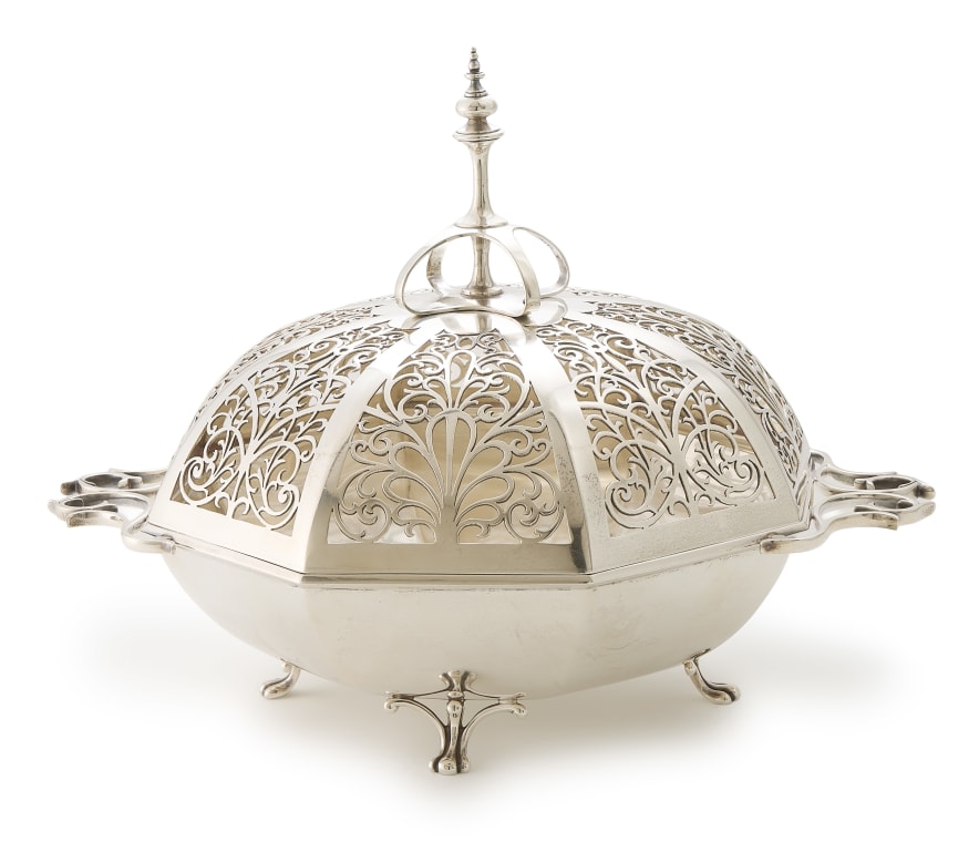 octagonal shape, the sides applied with pierced scroll work handles, the detachable pierced panels domed cover surmounted by a knopped finial, raised on four hoof feet, 1475g
