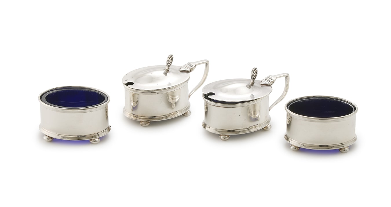 all with moulded rims, raised on four ball feet and mustards with harp shaped handles and shell thumbpieces, all with blue glass liners, all in 125g