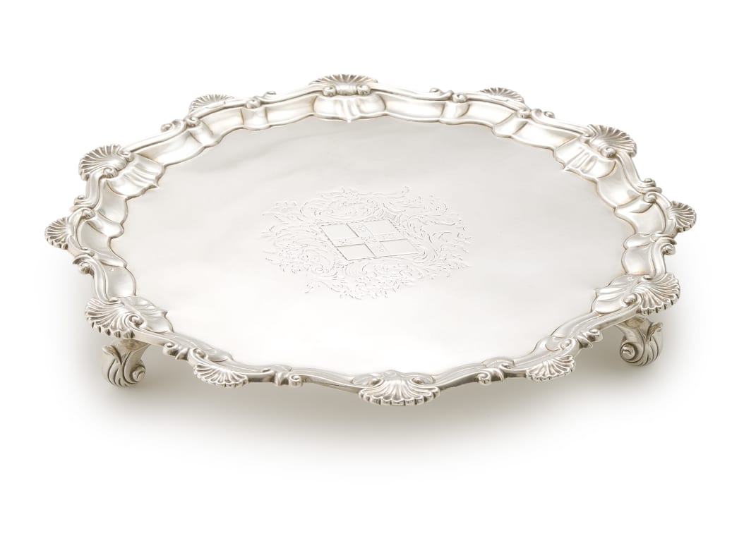 circular, with scroll and shell pattern border, the center engraved with a crest on three leaf-headed scroll feet, 755g