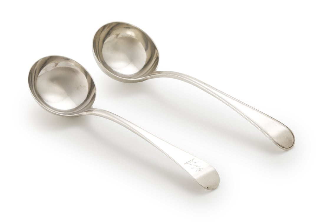A near pair of George III silver sauce ladles, Benjamin Smith III, London, 1783 and John Lampert, 1769