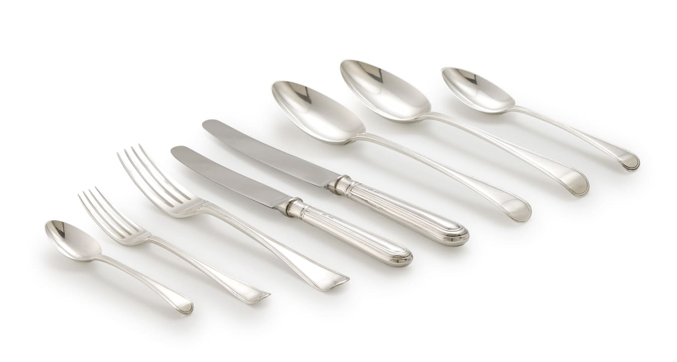 comprising: twelve dinner knives, twelve dinner forks, twelve dinner spoons, twelve dessert knives, twelve dessert forks, twelve dessert spoons, and twelve teaspoons, 2580g all in
