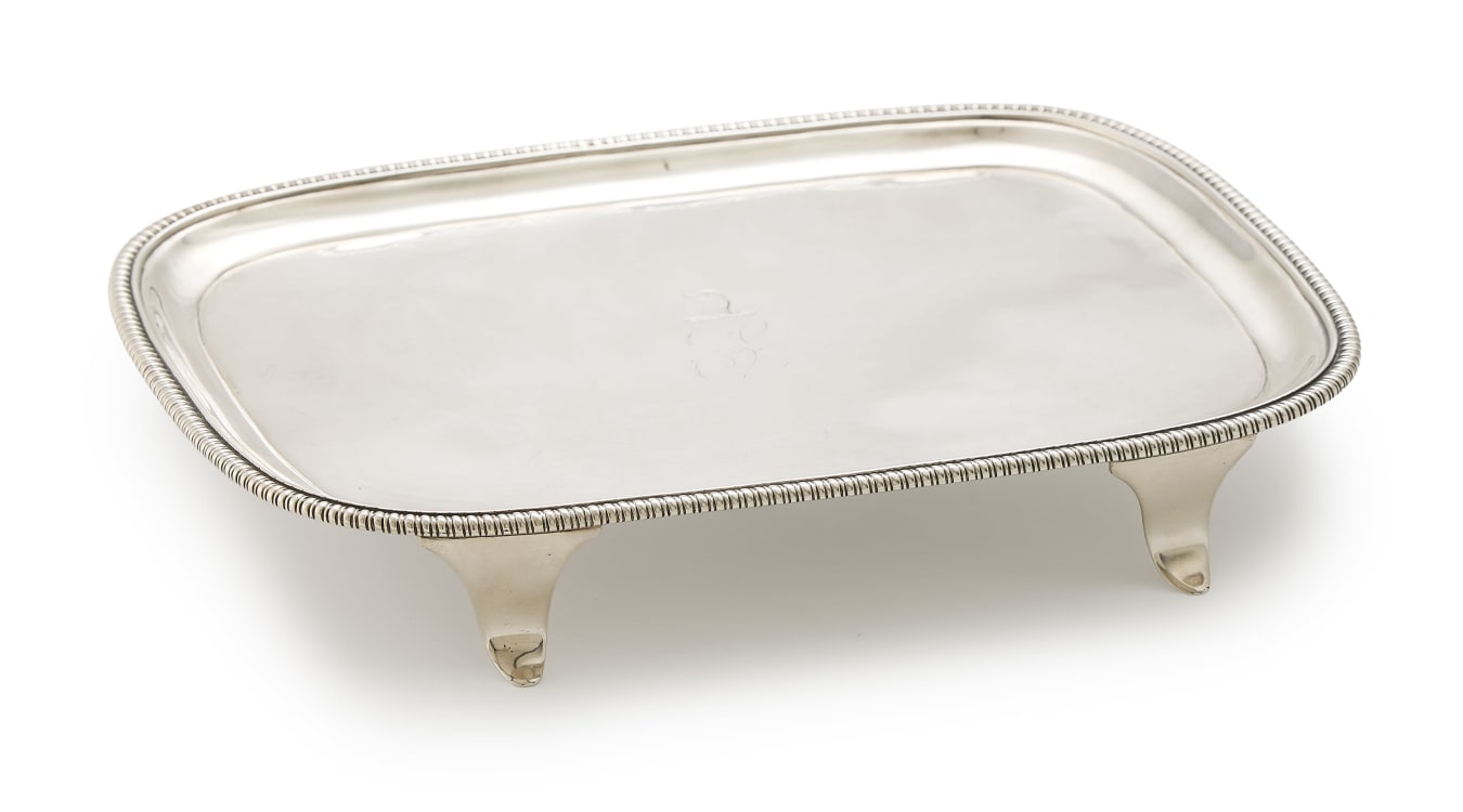 rectangular with gadrooned rim, the center engraved with a crest and initial, raised on four feet, 305g