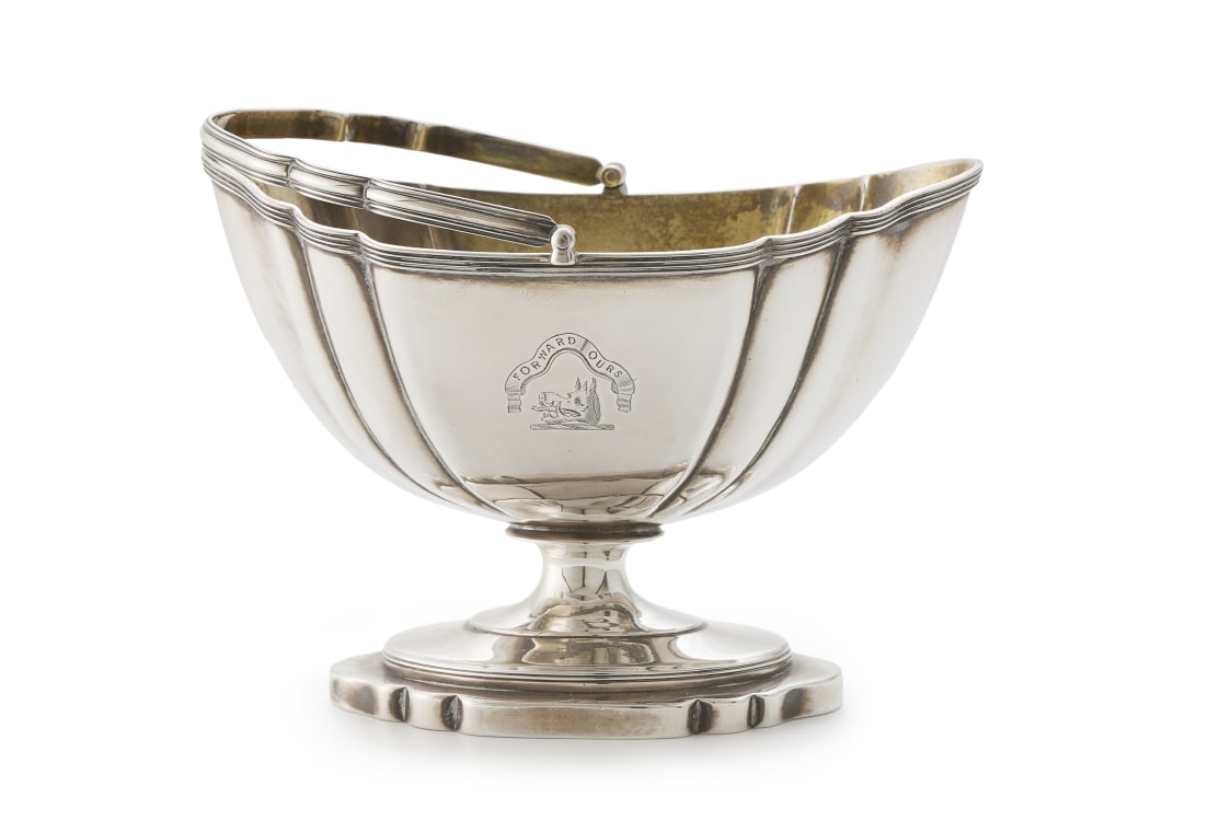 of navette form, moulded with a wavy rim, the fluted body engraved with a crest, 'FORWARD OURS', applied with a reeded swing-handle, raised on an oval base, gilt interior, 280g