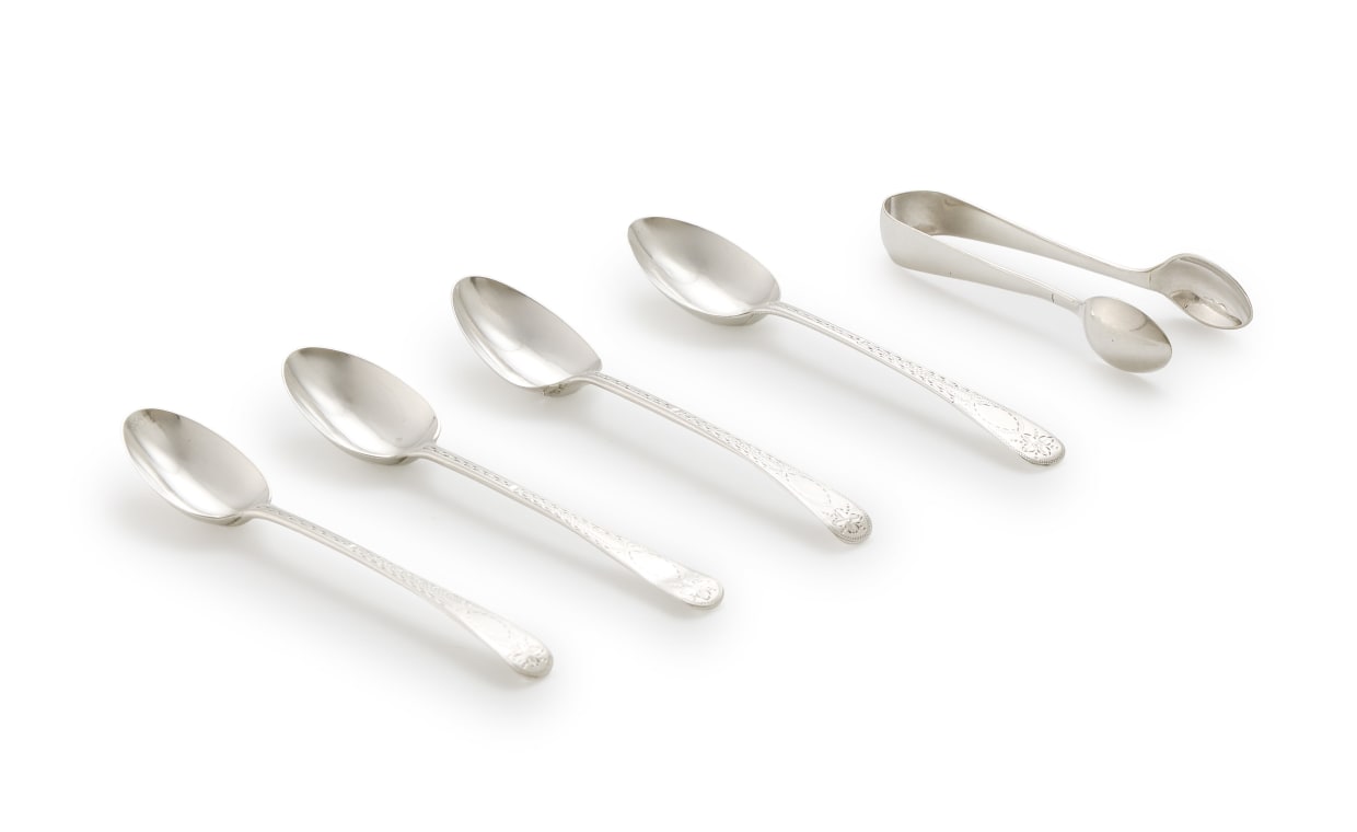 A miscellaneous set of George III silver teaspoons and tongs, William Eley I & William Fern, 1815