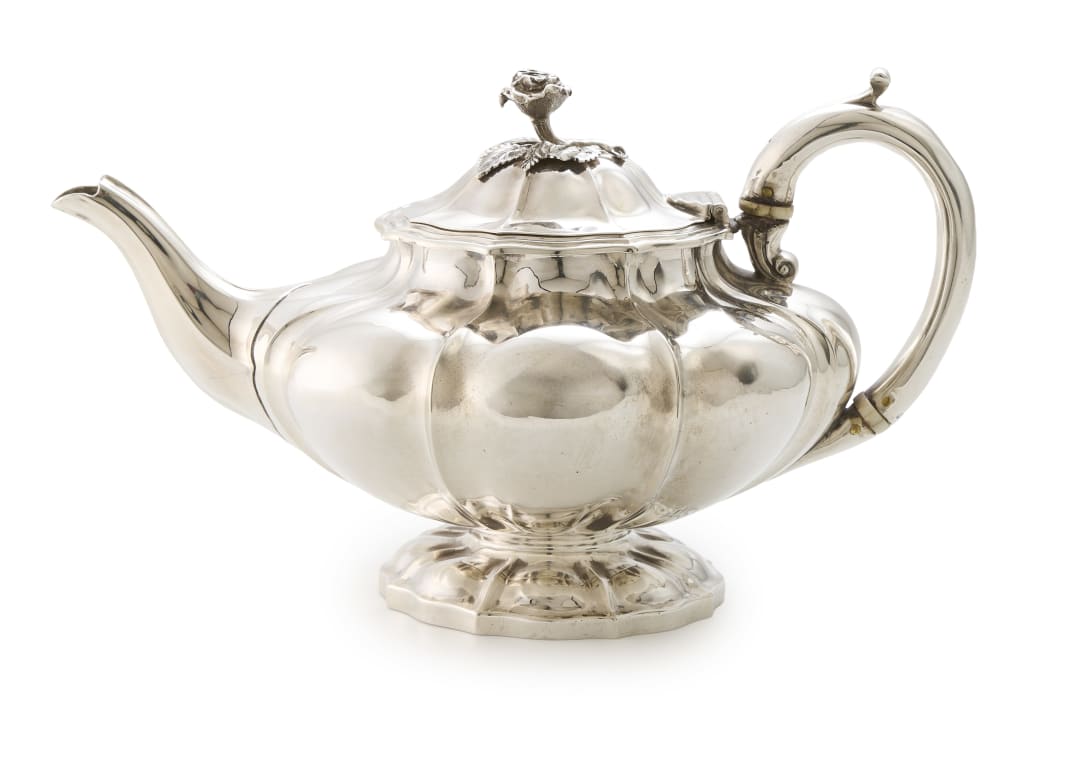 melon-form lobed body raised on a conforming circular footrim, the domed and hinged cover surmounted by a flower-and-bud finial, the side applied with a c-scroll leaf-capped handle, 720g