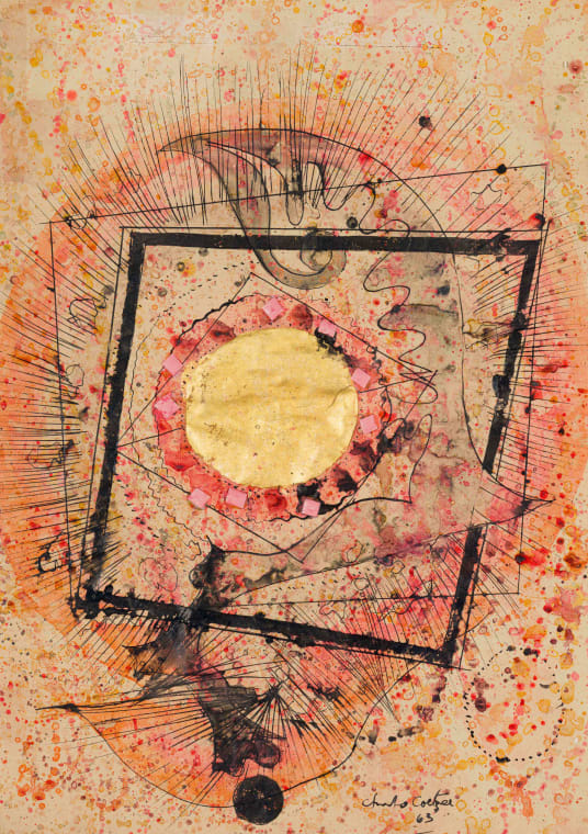 watercolour, pen, ink, enamel, collage and gouache on paper