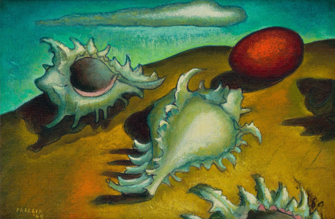 signed and dated '49; inscribed with the artist's name and the title 'Shells and Egg' on a Pretoria Art Museum label on the reverse