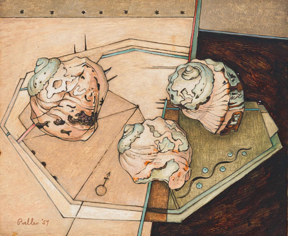The Shells was presumably first exhibited at the Lidchi Gallery in Johannesburg in April 1958. The painting shows three gleaming turban shells with whorls of pearly colour, knobbly blemishes, and sea-aged algae stains. These are placed on complex and overlapping hexagonal planes, bordered and intersected by coral and flash-blue lines, and decorated with stars, arcs and symbols. This poetic and otherworldly still life composition takes cues from earlier paintings such as Icarus (1951) and The Mango (1953), and is conceivably a companion piece to Eggs on a Plate, also painted in 1957. Both of these later works included astronomical connotations, in keeping with the artist's broad interest in the universe, and his fascination in the launch that year of Sputnik, the Soviet Union's earth-orbiting satellite. Predictably, the compositional design of The Shells reappeared in subsequent paintings, most notably in Ritual Bull (1962) and Icarus I (1971).
