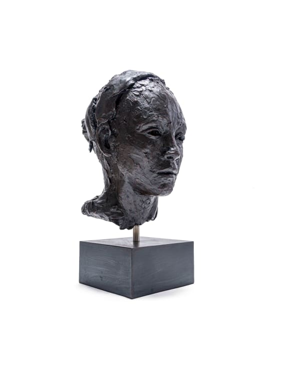 bronze with a dark brown patina, on a painted steel base