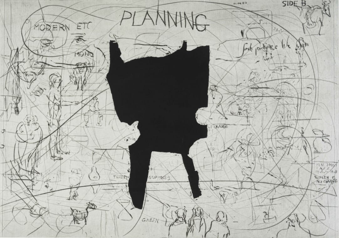 The black image in the centre of the plate was etched in afterwards, on Kentridge’s recommendation, to complete the work. The shape references the huge chalkboard Kentridge has in his studio, and opens the work up to other interpretations of what works should be present.