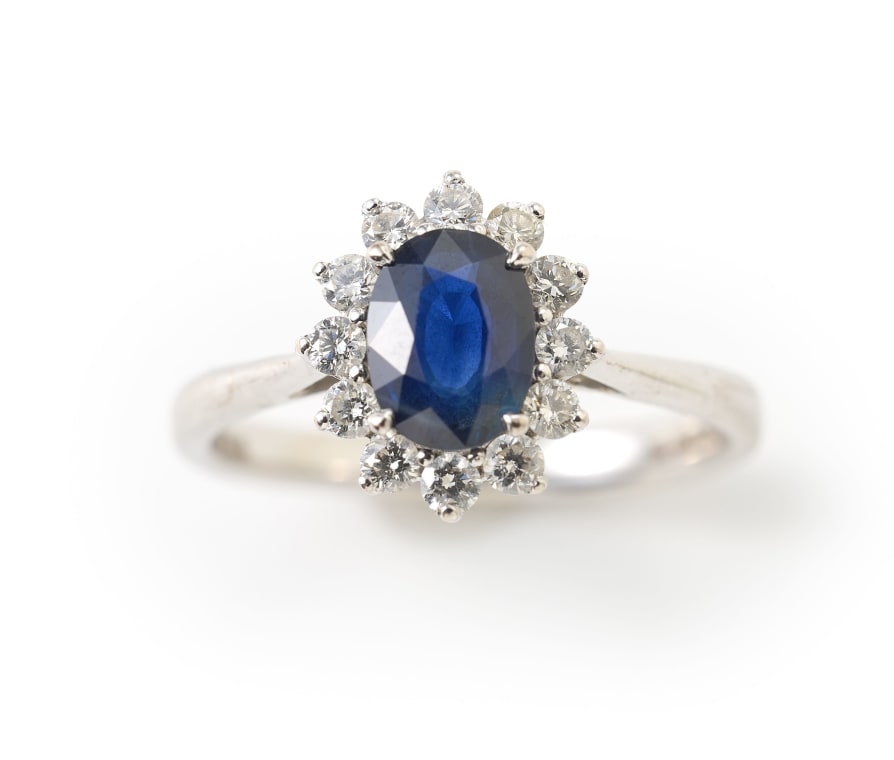 centered a claw-set oval-cut sapphire weighing approximately 0.98 ct, surrounded by 12 round brilliant-cut diamonds weighing approximately 0.32 ct, on a tapering half round band, 18k white gold, size L ½, total weight 3.26 grams