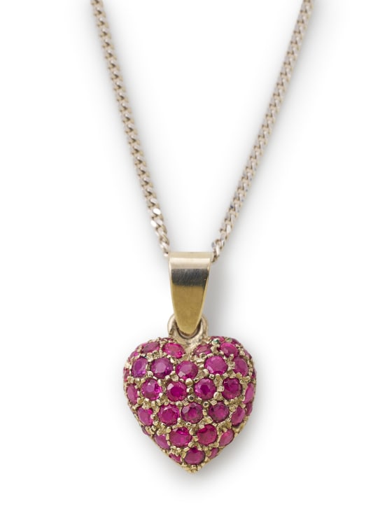 52 pavé-set round-cut rubies weighing 1.00 ct, with a simple bail, on a thin curb-link chain, 18k white gold, length approximately 45cm, total weight 5.60 grams
