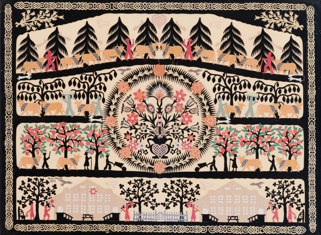 Anne Rosat is a celebrated Swiss artist best known for her innovative contributions to the traditional art of découpage. Born in 1935 in the Canton of Vaud, Rosat began her artistic practice in the 1960s, drawing inspiration from the 19th century folk artist Johann-Jakob Hauswirth (1809–1871). While rooted in the customs of Alpine folk art, her work departs from convention through her distinctive use of vivid colour, embossed textures, and layered compositions, often dominated by her signature red palette.