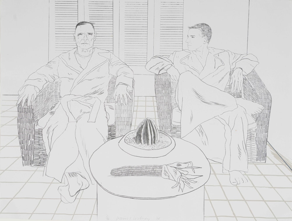 In 1968, Hockney painted a large double portrait of Isherwood and Bachardy seated in their Santa Monica home, overlooking Malibu Beach where the couple had met in 1952. This lithograph, created eight years later, closely echoes that composition.2 Hockney recalled, “Whenever I said, ‘Relax,’ Christopher always sat with his foot across his knee, and he always looked at Don. Don never looked that way; he was always looking at me. So I thought, that’s the pose it should be.” The composition—with one sitter engaging the viewer and the other in profile—was Hockney’s first exploration of this dynamic, one he revisited frequently throughout his career.3