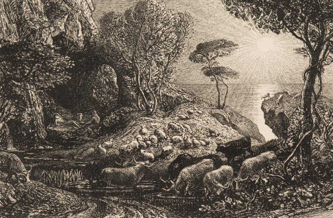 inscribed 'The cream-bowl set and in our cave recline. (Its brows with poplar shaded, watch the West), And timely, with the sun, together rest' in the image; accompanied by a William Weston Gallery valuation certificate inscribed with the artist's name, the title and medium, and further accompanied by The English Vision exhibition catalogue