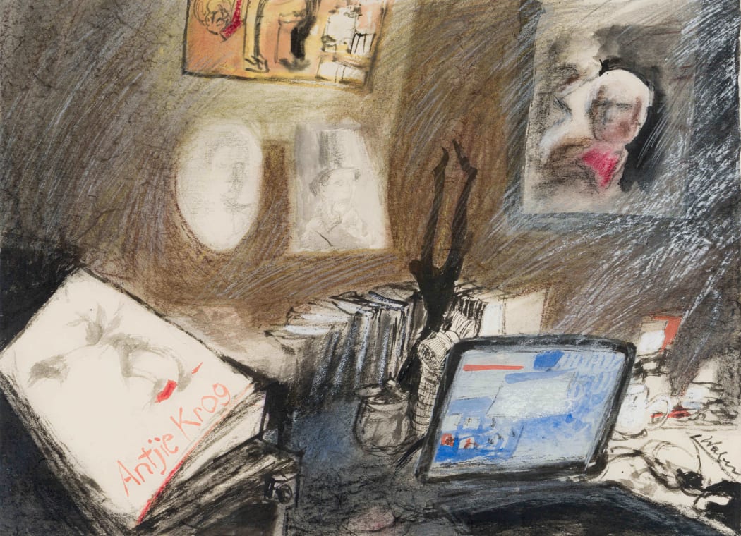 In 2015, Linda Waber drew in Antjie Krog’s studio – or more accurately, her writing workshop – which was a particularly exciting experience for her. Having conducted research beforehand, Waber knew that Krog had translated Long Walk to Freedom (1995) by Nelson Mandela into Afrikaans and was already deeply impressed by her literary work. During their conversation, Waber learned that Krog’s role models included Archbishop Desmond Tutu and Moshoeshoe I, the first king of Lesotho – figures subtly referenced in the resulting studio drawing and recognisable once this context is known. Waber’s studio drawings are created using a mixed-media technique involving black ink, brushes, pastel chalks, and various pencils. For the works made in South Africa, she used Japanese paper, chosen for its durability and suitability for travel; she had previously visited Japan on a scholarship in 1970 and exhibited there several times. Waber has exhibited in South Africa twice, in 2010 and again in 2015 at the Irma Stern Museum. Two books have been published documenting her Studio Drawing series, covering all works up to 2003, with the drawings also featured in other publications and represented in collections, particularly in Austria. Professor Rudolf Leopold – the notable collector of Egon Schiele and Gustav Klimt and founder of the Leopold Museum in Vienna acquired around 50 of Waber’s studio drawings during his lifetime, which are now housed in the museum or held by the Leopold II Foundation.