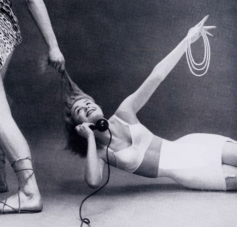 Willis Thomas’ extracted scene presents a slender white woman covered only by a brassiere and girdle, smiling whilst being dragged by her hair across the floor by an unknown (presumably male) figure. Holding a telephone to her left ear, she gazes gleefully at the anonymous character. Here, her surmisable pain is supplanted with pleasure, an inversion of the violence inherent in being pulled by one’s hair. The crude humour of the ad and its accompanying title indexes a moment of innovation in the design of women’s shapewear, the transition from ‘boned’ corsets to flexible materials. But for Willis Thomas, the captured memory of the image is not the development of a more comfortable corset, but the consistent treatment of the white woman’s body as an object of desire – something to be pulled and contorted into an idealised form.