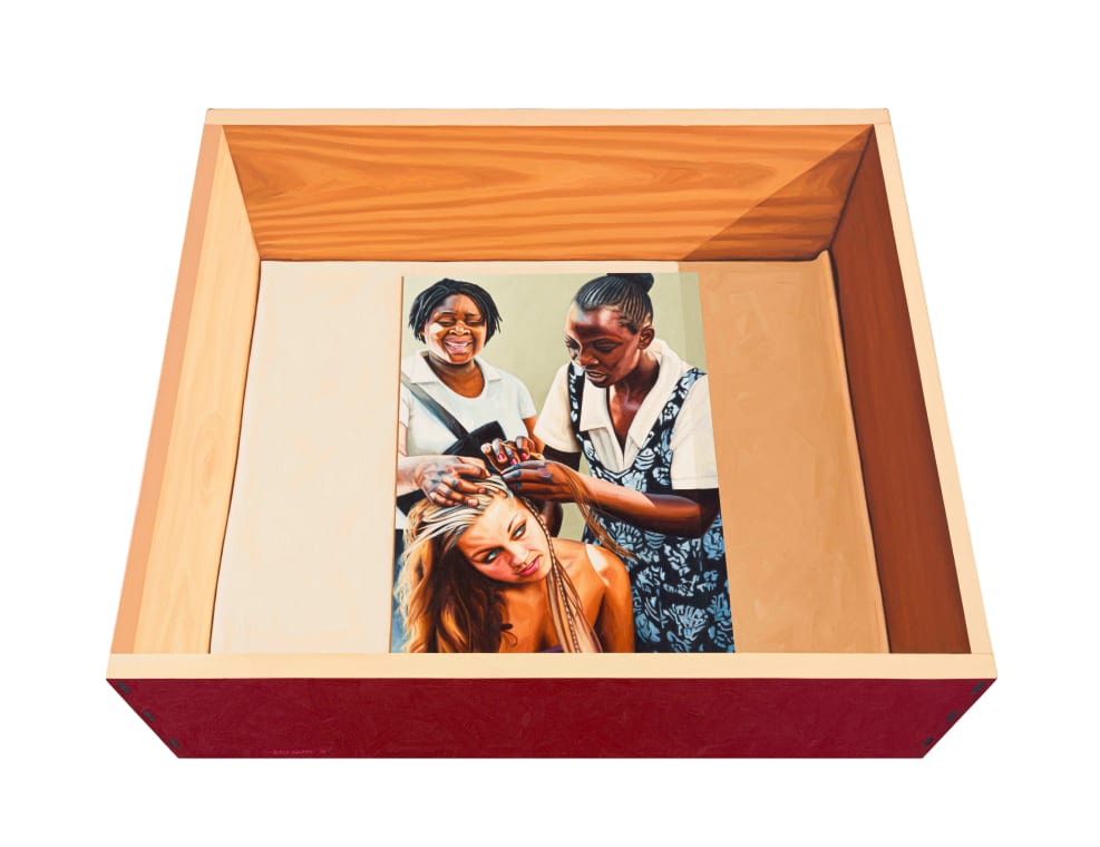 The present lot is a striking example of Ndlovu's documentation of black life, rendered with both humour and sincerity. The scene depicts an interaction involving three women: two black women braid the blonde hair of a white woman. Suspended within the illusion of a crate, the scene evokes the sense of a memory or familiar moment the artist recalls. The title suggests a casual remark the artist may have overheard between the stylists as they work, while the white woman sits hunched forward in discomfort as her hair is pulled into the style. The title offers insight into the conversational and tactile rhythms of the salon anchoring the painting in lived experience.