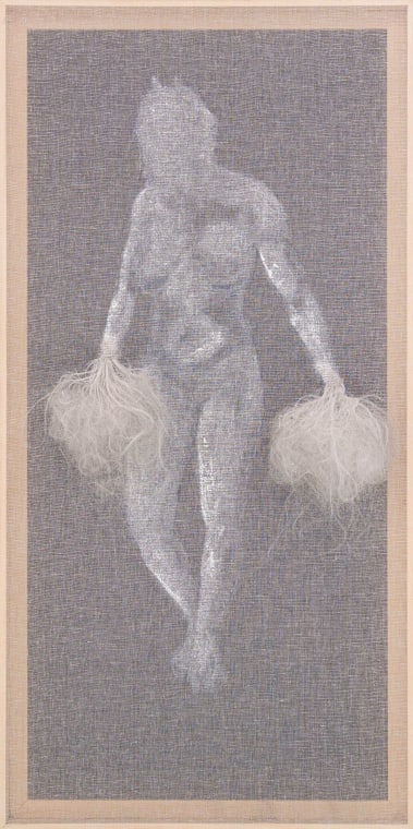 “In charting this slow, painful and meandering journey of death, grief and rebirth, Msezane’s interweaving of cloud-like hair tufts and snuff on this porous canvas calls into being a spirit that is insistently and materially present. In so doing, she complicates and collapses the boundaries between spirit and matter, surface and material, memory and present reality, fragmentedness and repair. Interweaving the celestial and the terrestrial through these materials, Msezane reflects her grappling with complex and conflicting physical, emotional, mental, and spiritual states during painful seasons of transformation.”—Xola Nhliziyo