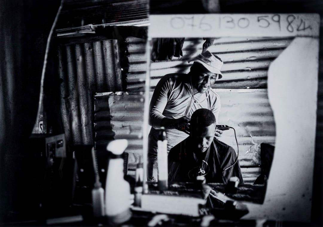 The present lot features Mhlubulo, the proprietor of a barbershop within the hostel, pictured with one of his customers. His establishment, which offers a range of haircuts and operates from early morning until late at night, reflects the informal economies that sustain life within the complex. Through his documentary approach, Buthelezi reveals how the hostel has evolved from a transient labour compound into a multi-generational community characterised by family life, entrepreneurship and social cohesion.3