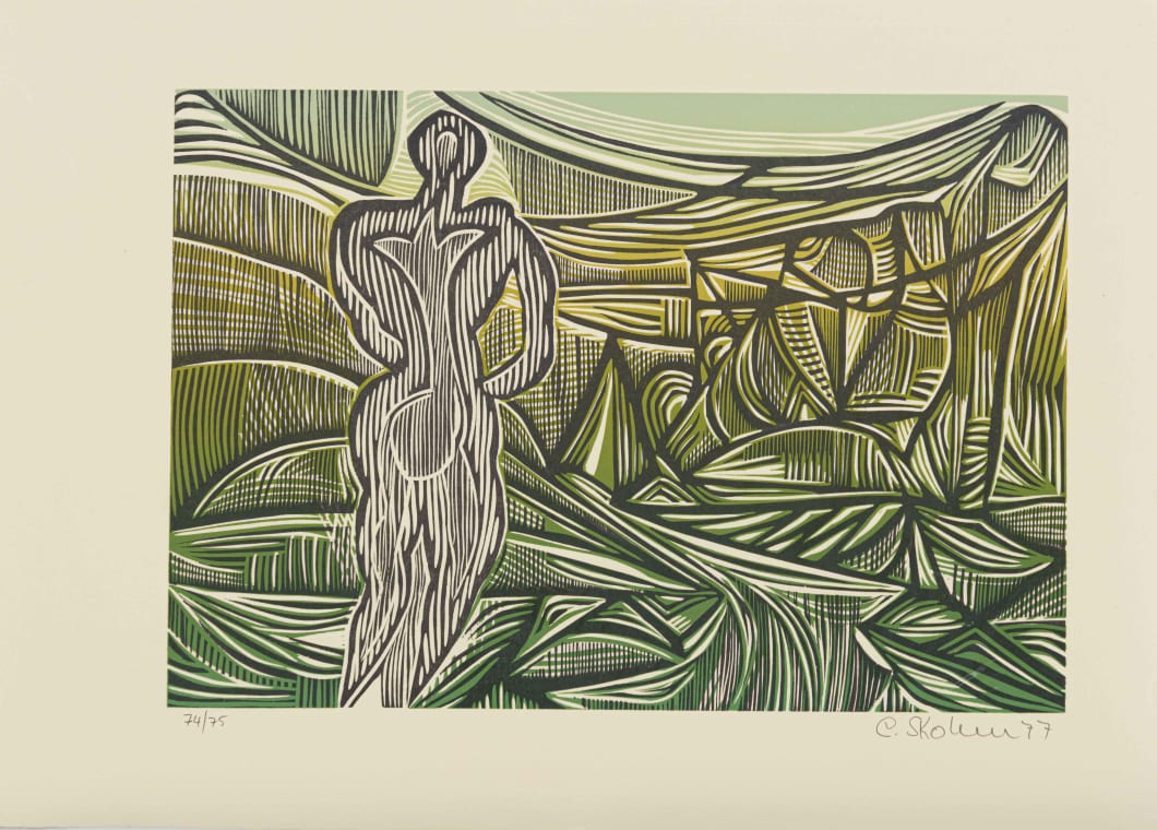 Printed from the original block for the portfolio Man's Gold, 1975−1979, which consisted of 28 woodcuts by Cecil Skotnes, and 6 poems with text by Stephen Gray, based on ideas by Denis Godfrey, published by Egon Guenther.