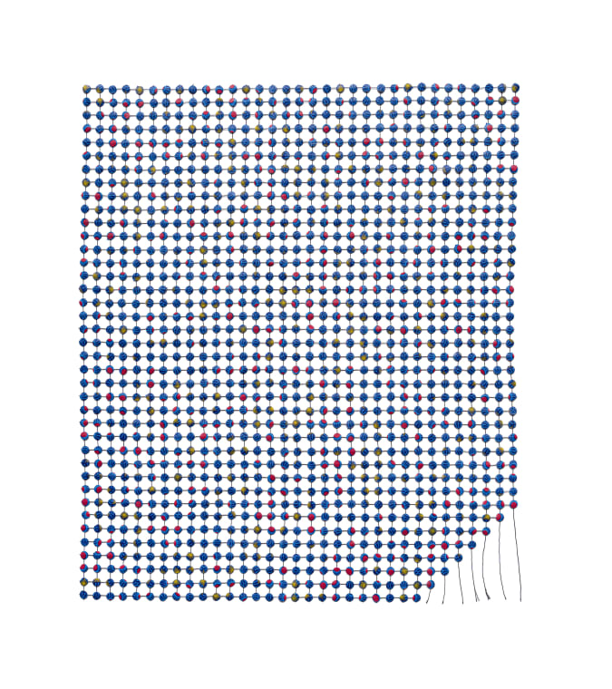 "Her creations with multi coloured Shweshwe fabrics are stapled, coiled, threaded and painted over. Kavula plays with this fabric - its sentimental and cultural significance - whilst veering away from its intelligible significance to traditional (Sotho-Tswana) ceremony and gatherings. She plays with the neatness of meaning, interrogates the possibilities of scale, surface and materiality."1