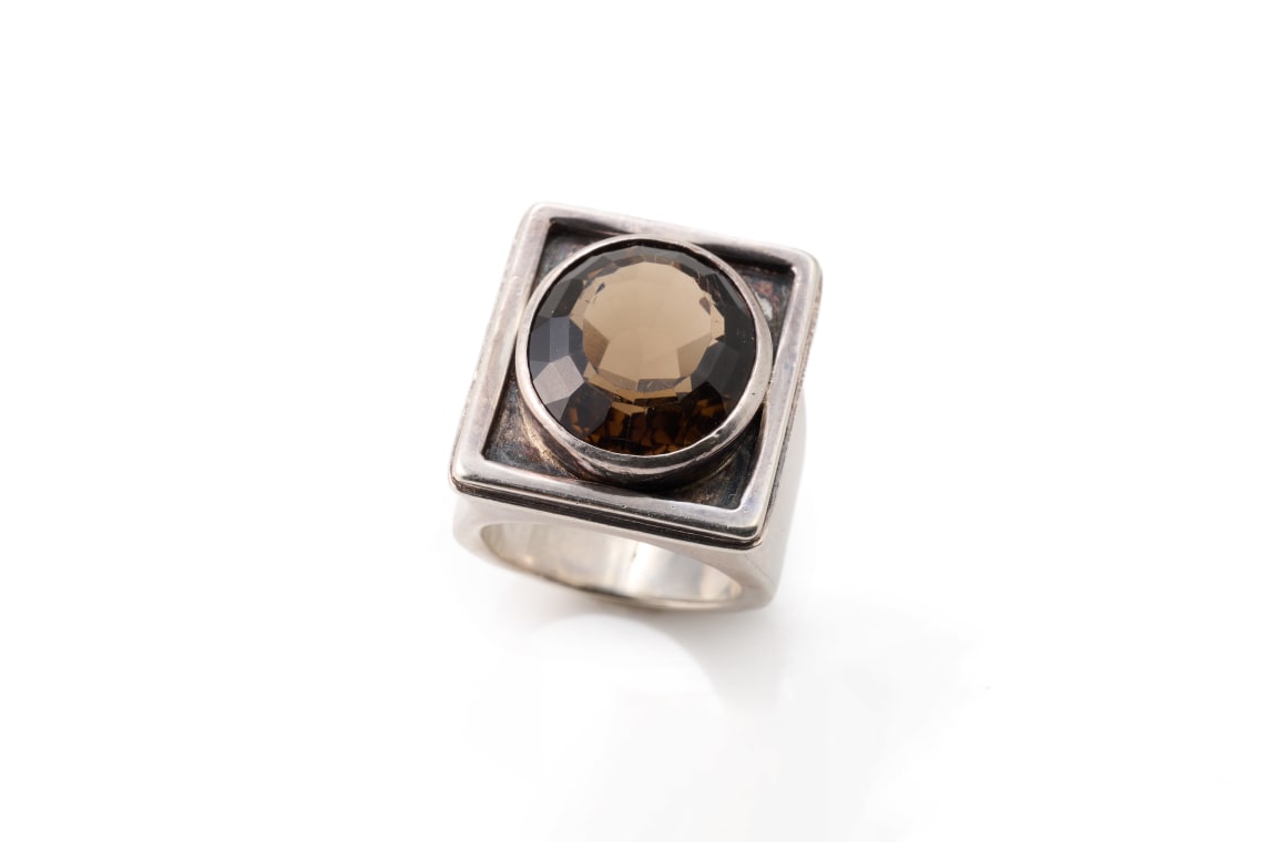 set in a rectangular design, a tube-set oval step-cut smoky quartz weighing approximately 5.33 ct, on a tapering flat band, silver, stamped 'MR', size H, total weight 12.90 grams